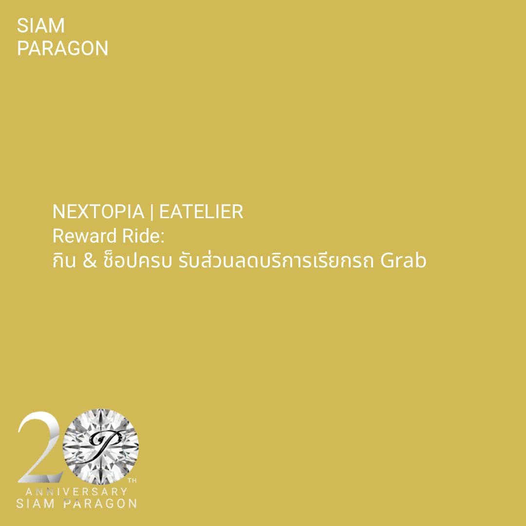 รับส่วนลด 15%* สูงสุด 100 บาท เมื่อใช้บริการเรียกรถ Grab โดยไม่มีขั้นต่ำ (สำหรับการเดินทางออกจากสยามพารากอน หรือจุดหมายปลายทางที่สยามพารากอนเท่านั้น) เมื่อมียอดใช้จ่ายขั้นต่ำ 200 บาทขึ้นไป ณ ร้านค้าที่ NEXTOPIA ชั้น 5 และ EATELIER ชั้น 4 สยามพารากอน