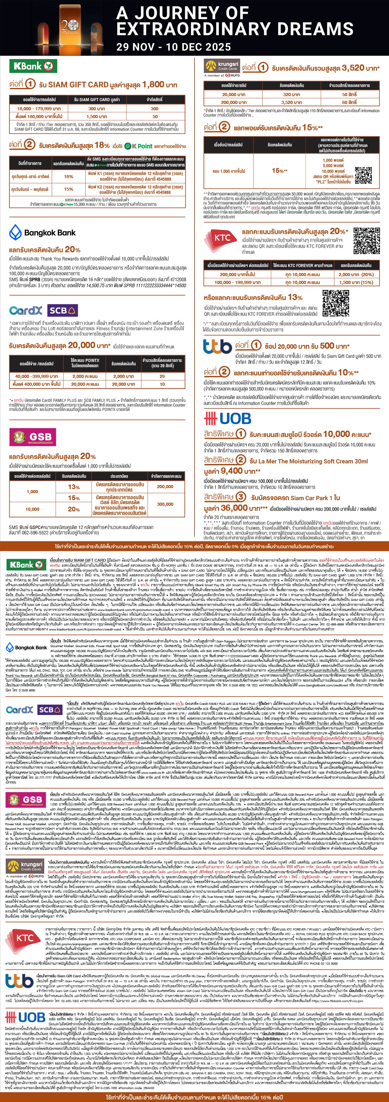 สิทธิพิเศษจากบัตรเครดิตที่ร่วมรายการ SIAM PARAGON 20TH ANNIVERSARY: A JOURNEY OF EXTRAORDINARY DREAMS